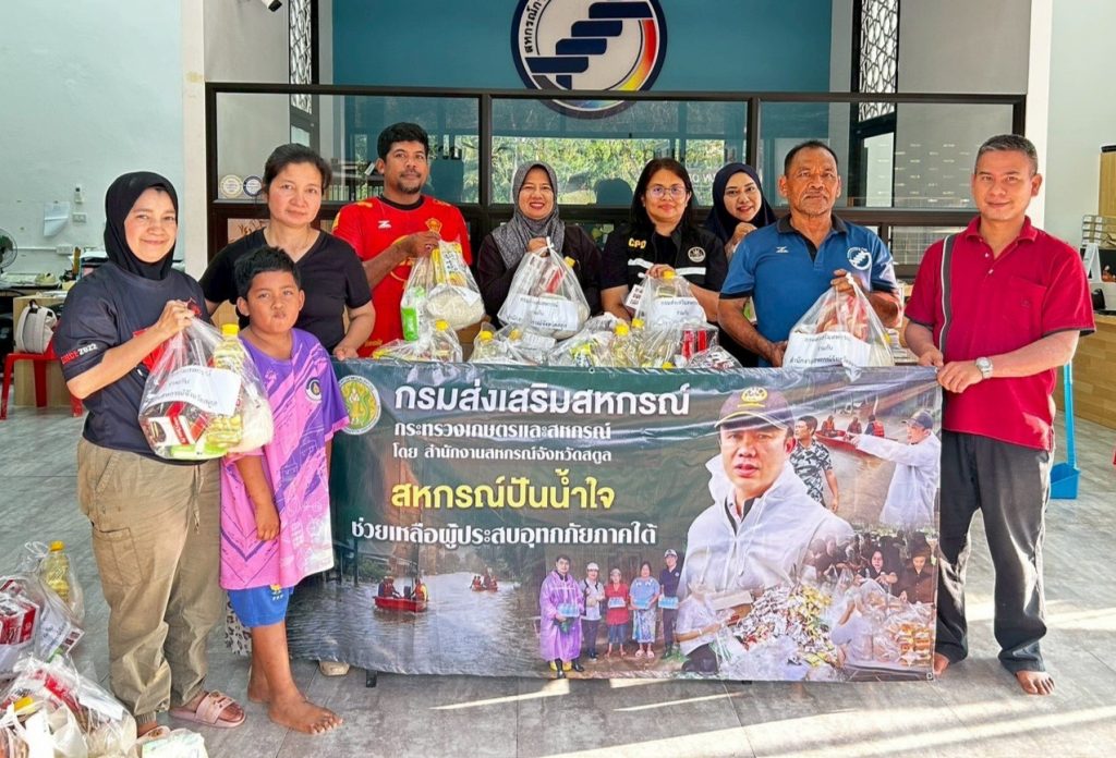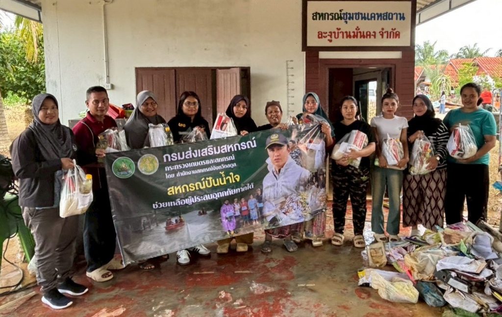 นายนิรันดร์ มูลธิดา อธิบดีกรมส่งเสริมสหกรณ์ เปิดเผยว่า กรมส่งเสริมสหกรณ์ได้ติดตามสถานการณ์อุทกภัยภาคใต้อย่างใกล้ชิด และได้สั่งการให้สหกรณ์จังหวัดภาคใต้ทั้ง 9 จังหวัดที่อยู่ในพื้นที่น้ำท่วมภาคใต้ ได้แก่ จังหวัดสงขลา สตูล นครศรีธรรมราช พัทลุง สุราษฎร์ธานี นราธิวาส ยะลา ปัตตานี และตรัง ลงพื้นที่ช่วยเหลือบรรเทาความเดือดร้อนให้กับสมาชิกสหกรณ์/กลุ่มเกษตรกรและประชาชนในพื้นที่น้ำท่วมอย่างต่อเนื่องตั้งแต่เกิดเหตุการณ์น้ำท่วมจนสถานการณ์คลี่คลายลง ทั้งการเปิดโรงครัวทำอาหารและข้าวกล่องแจกจ่ายให้กับผู้ประสบอุทกภัย การจัดสิ่งของเครื่องอุปโภคบริโภคใส่ถุงยังชีพเพื่อนำไปมอบให้กับสมาชิกสหกรณ์และกลุ่มเกษตรกรและชาวบ้านในพื้นที่น้ำท่วม รวมถึงการระดมความช่วยเหลือจากเครือข่ายสหกรณ์ในจังหวัดต่าง ๆ ทั้งภาคเหนือ ภาคกลาง และภาคตะวันออกเฉียงเหนือในการจัดส่งข้าวสาร นม ไข่ไก่ น้ำดื่ม และวัตถุดิบในการปรุงอาหารเพื่อเร่งจัดส่งไปยังสหกรณ์ในพื้นที่ภาคใต้ได้นำไปกระจายแจกจ่ายให้กับประชาชนที่อยู่ในพื้นที่ประสบภัย