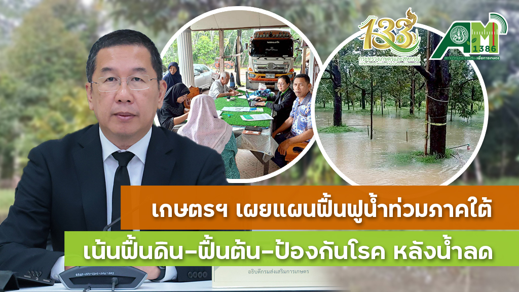 นายพีรพันธ์ คอทอง อธิบดีกรมส่งเสริมการเกษตร เปิดเผยว่า ได้รับข้อสั่งการจากร้อยเอก ธรรมนัส พรหมเผ่า รองนายกรัฐมนตรี และรัฐมนตรีว่าการกระทรวงเกษตรและสหกรณ์ ในการเตรียมแผนฟื้นฟูพื้นที่การเกษตรหลังสถานการณ์น้ำท่วมภาคใต้ เพื่อรับมือและเข้าช่วยเหลือเกษตรกรที่ประสบภัยพิบัติดังกล่าวแล้ว โดยเน้นการฟื้นฟูสภาพดินและสร้างความแกร่งของพืชให้ทนทาน ฟื้นตัว และปรับตัวได้ โดยแบ่งการดำเนินงานเป็น 3 ระยะ คือ ระยะที่ 1 ช่วยเหลือเร่งด่วนและสำรวจ โดยให้เจ้าหน้าที่ลงพื้นที่สำรวจและประเมินความเสียหาย รวมทั้งตรวจสอบสอบทานกับการขึ้นทะเบียนเกษตรกร เพื่อเข้าสู่กระบวนการช่วยเหลือตามระเบียบกระทรวงการคลังต่อไป ระยะที่ 2 ฟื้นฟูดูแลรักษาพืช โดยเตรียมพร้อมแจกจ่ายชีวภัณฑ์ไตรโคเดอร์มาและชีวภัณฑ์ควบคุมโรคพืช บีเอส (บาซิลลัส ซับทิลิส) เพื่อฟื้นฟูโรครากเน่าโคนเน่าตั้งแต่เดือนธันวาคม 2568 ถึงกุมภาพันธ์ 2569 ครอบคลุมพื้นที่ประสบภัยประมาณ 200,000 ไร่ และสนับสนุนเมล็ดพันธุ์พืชผักสวนครัวเพื่อลดรายจ่ายครัวเรือนและสร้างรายได้ระยะสั้น ระยะที่ 3 สร้างความยืดหยุ่นและเตรียมพร้อม โดยถอดบทเรียนการจัดการแปลงตามแนวทางการปรับตัวล้มแล้วลุกเร็ว เพื่อสร้างความแกร่งของพืชให้ทนได้ ฟื้นตัว และปรับตัวได้ รวมถึงมาตรการฟื้นฟูอื่นๆ และปัจจัยการผลิตที่ต้องสนับสนุน