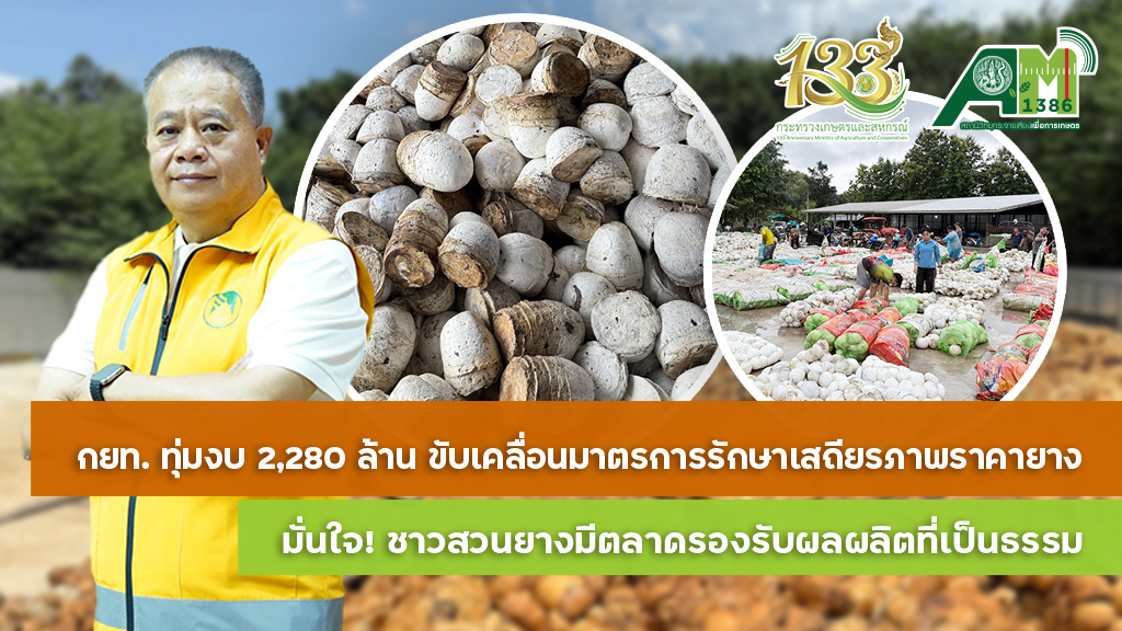 กยท. ทุ่มงบ 2,280 ล้าน ขับเคลื่อนมาตรการรักษาเสถียรภาพราคายาง คาดดูดซับยาง 2.5 แสนตัน/ปี มั่นใจ! ชาวสวนยางมีตลาดรองรับผลผลิตที่เป็นธรรม-ผู้ประกอบการได้ยางคุณภาพ