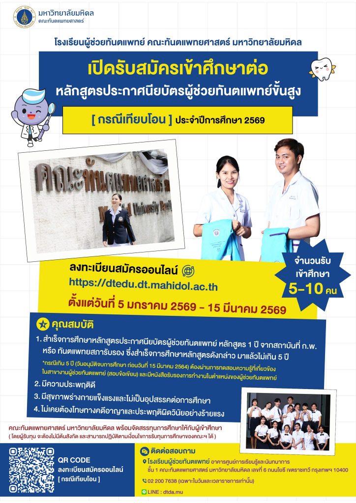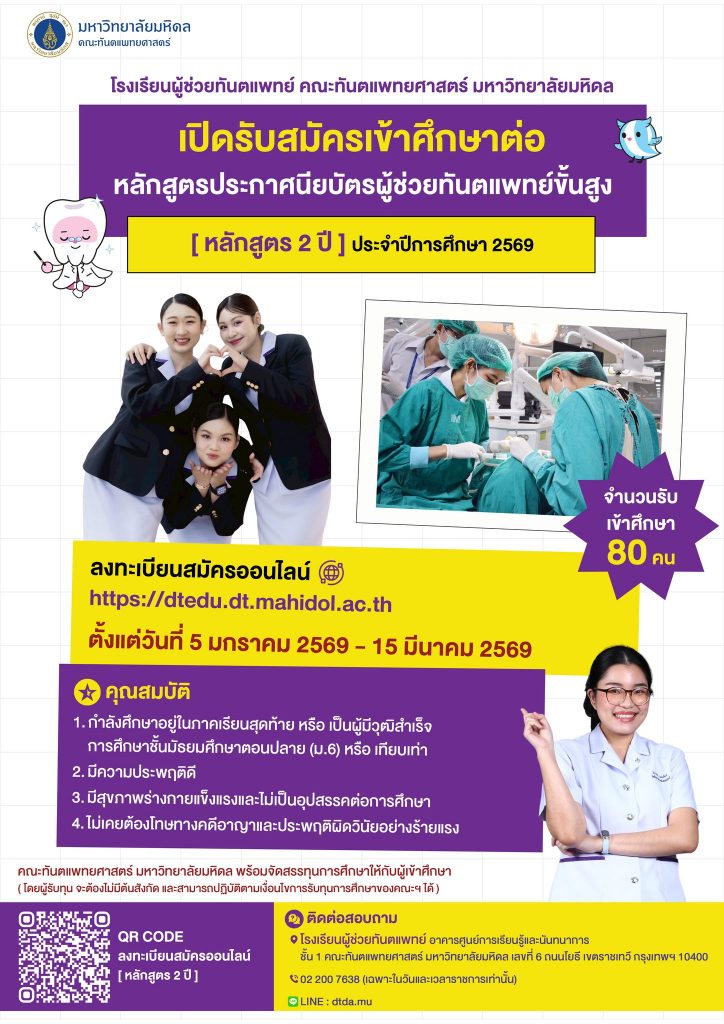 คณะทันตแพทยศาสตร์ มหาวิทยาลัยมหิดล เปิดรับสมัครรับผู้สำเร็จการศึกษาวุฒิมัธยมศึกษาตอนปลาย (ม.6) หรือ เทียบเท่า เข้าศึกษาต่อหลักสูตรประกาศนียบัตรผู้ช่วยทันตแพทย์ขั้นสูง (หลักสูตร 2 ปี) จำนวน 80 คน และหลักสูตรประกาศนียบัตรผู้ช่วยทันตแพทย์ขั้นสูง (กรณีเทียบโอน) จำนวน 5-10 คน ประจำปีการศึกษา 2569 โดยผู้เข้าศึกษาทุกคนจะได้รับทุนการศึกษา ตามที่คณะทันตแพทยศาสตร์ มหาวิทยาลัยมหิดล กำหนด (ยกเว้น ผู้ที่มีหนังสือขอความอนุเคราะห์เข้าศึกษาจากต้นสังกัด และเมื่อสำเร็จการศึกษาต้องกลับไปปฏิบัติงานที่ต้นสังกัดเดิม)