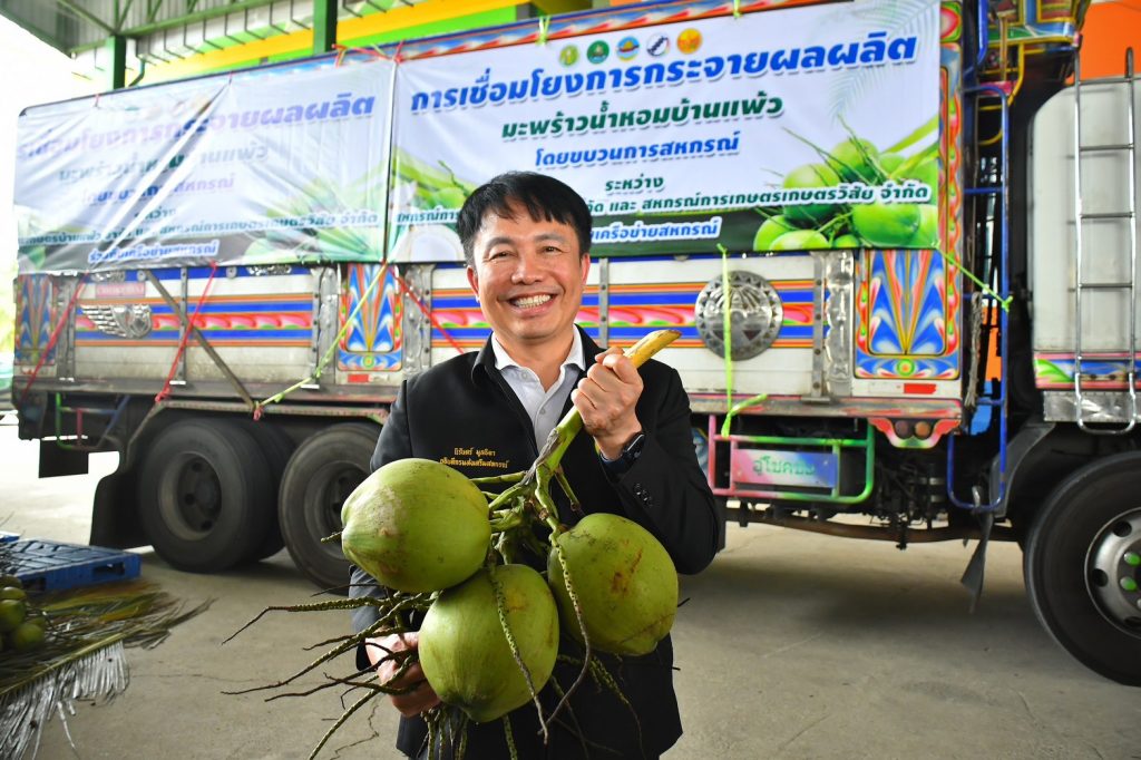 อธิบดีกรมส่งเสริมสหกรณ์ เปิดเผยว่า ในวันนี้ได้มาตรวจเยี่ยมการรวบรวมผลผลิตมะพร้าวน้ำหอมของเกษตรกรในพื้นที่จังหวัดสมุทรสาคร ขณะนี้พบว่าเกษตรกรชาวสวนมะพร้าวกำลังเผชิญปัญหาผลผลิตตกต่ำอย่างหนัก เมื่อเทียบกับเดือนกุมภาพันธ์ 2568 ราคามะพร้าวหน้าสวนเฉลี่ยลูกละ 23 – 28 บาท แต่ปัจจุบันราคาที่เกษตรกรขายหน้าสวนลดลงเหลือ ลูกละ 2 บาท กรมส่งเสริมสหกรณ์จึงหาแนวทางให้ความช่วยเหลือในเบื้องต้นเพื่อบรรเทาปัญหาและยกระดับราคาในระยะเร่งด่วน โดยใช้กลไกตลาดของเครือข่ายสหกรณ์เข้ามาช่วยแก้ปัญหาให้กับเกษตรกรชาวสวนมะพร้าวในจังหวัดสมุทรสาครและจังหวัดราชบุรี โดยมีเป้าหมายในการรวบรวมทั้ง 2 จังหวัด 1,000,000 ลูก และมีแผนกระจายผลผลิตมะพร้าวไปยังเครือข่ายสหกรณ์ในภาคตะวันออกเฉียงเหนือ 30,000 ลูก ซึ่งในวันนี้จะมีการปล่อยรถบรรทุกมะพร้าวน้ำหอมไปตลาดปลายทางที่จังหวัดร้อยเอ็ด โดยสหกรณ์การเกษตรเกษตรวิสัย จำกัด จังหวัดมหาสารคาม โดยสหกรณ์การเกษตรบรบือ จำกัด และจังหวัดยโสธร โดยสหกรณ์การเกษตรกุดชุม จำกัด สั่งซื้อจากสหกรณ์การเกษตรบ้านแพ้ว จำกัด จำนวน 20,000 ลูก ขณะที่สหกรณ์ต้นทางที่รวบรวมมะพร้าวน้ำหอมรับซื้อผลผลิตจากสมาชิกในราคาลูกละ 5 บาท และส่งขายให้เครือข่ายสหกรณ์ตลาดปลายทาง ลูกละ 6-7 บาท