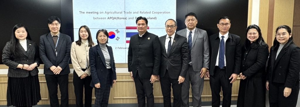วันที่ 2 กุมภาพันธ์ 2569 นายรพีภัทร์ จันทรศรีวงศ์ อธิบดีกรมวิชาการเกษตร พร้อมด้วยนายธานี แสงรัตน์ เอกอัครราชทูตไทย ณ กรุงโซล นำคณะผู้แทนกรมวิชาการเกษตรเข้าหารือกับ Ms. Park Kyung-hee ปฏิบัติหน้าที่อธิบดีกรมกักกันพืช สัตว์ และอาหาร และผู้อำนวยการกองบริหารการส่งออก กรมกักกันพืช สัตว์ และอาหาร (Animal and Plant Quarantine Agency: APQA) สาธารณรัฐเกาหลี เพื่อเร่งผลักดันการขยายตลาดสินค้าเกษตรมูลค่าสูงของไทยเข้าสู่ตลาดเกาหลีใต้