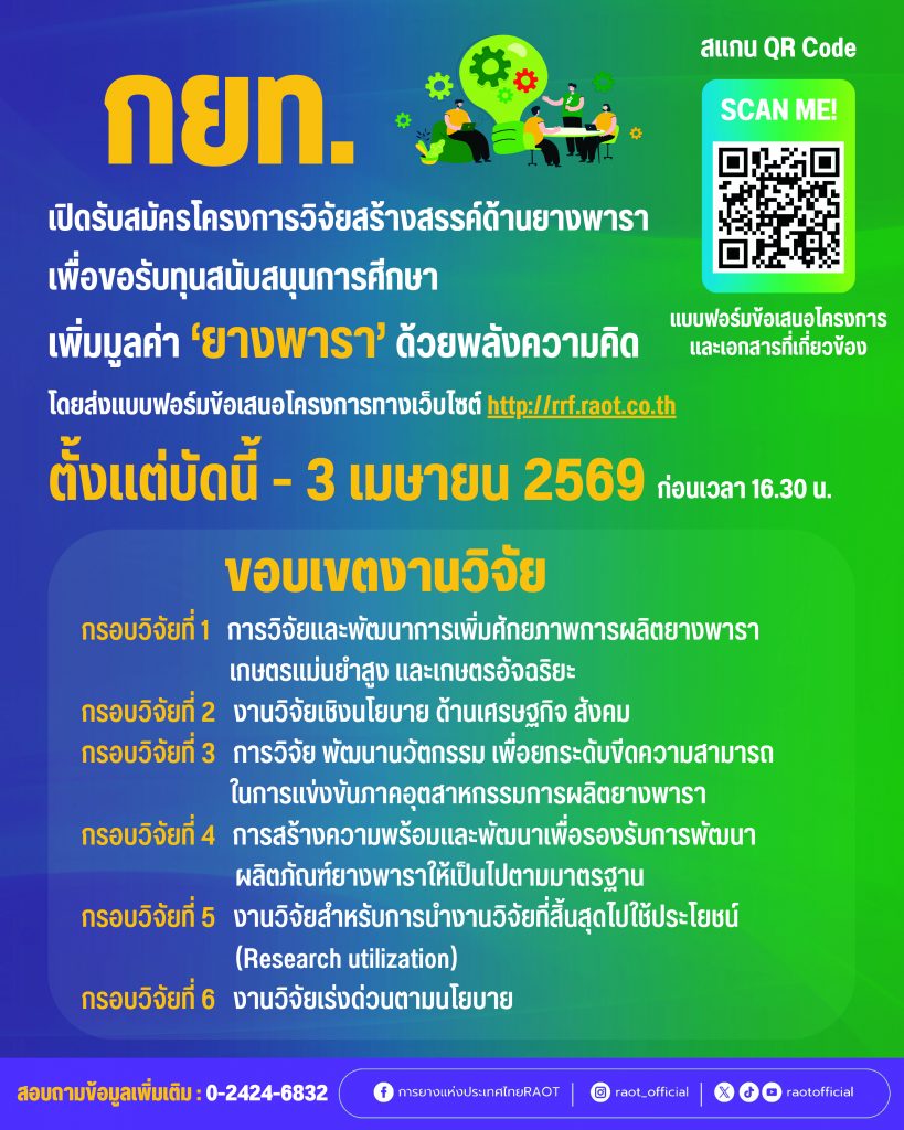ผู้ที่ประสงค์จะยื่นขอเสนอโครงการวิจัย สามารถดาวน์โหลดแบบฟอร์มของ กยท. และเอกสาร รายละเอียด หลักเกณฑ์ คุณสมบัติ และเอกสารที่เกี่ยวข้องได้ที่ QR Code ตามที่ประกาศกำหนด หรือผ่านทางเว็บไซต์ www.raot.co.th พร้อมจัดทำข้อเสนอโครงการวิจัยฉบับสมบูรณ์ (Full Proposal) และส่งผ่านระบบบริหารงานวิจัยและนวัตกรรมของ กยท. ทางเว็บไซต์ https://rrf.raot.co.th/ ตั้งแต่วันที่ 2 กุมภาพันธ์ 2569 ถึงวันที่ 3 เมษายน 2569 ก่อนเวลา 16.30 น. เท่านั้น หากพ้นระยะเวลาที่ กยท. กำหนด ขอสงวนสิทธิ์ไม่รับพิจารณา และสอบถามรายละเอียดเพิ่มเติมได้ที่ กองบริหารงานวิจัย สถาบันวิจัยยาง โทร. 0-2424-6832