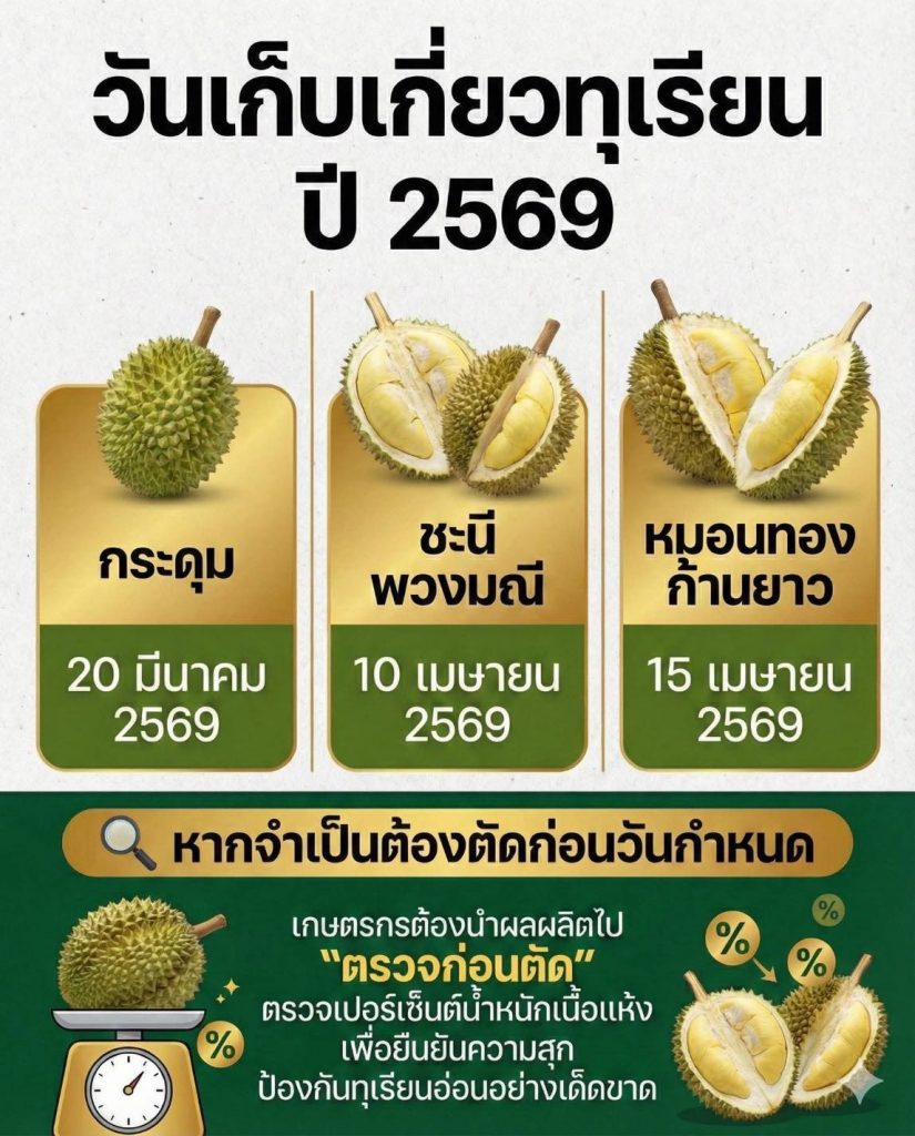 โดยคาดว่าจะเริ่มทยอยเก็บเกี่ยวทุเรียนพันธุ์กระดุมได้ตั้งแต่วันที่ 20 มีนาคม 2569 พันธุ์ชะนีและพวงมณีตั้งแต่วันที่ 10 เมษายน 2569 และพันธุ์หมอนทองรวมถึงพันธุ์ก้านยาว ตั้งแต่วันที่ 15 เมษายน 2569 เป็นต้นไป ทั้งนี้ หากเกษตรกรมีความจำเป็นต้องเก็บเกี่ยวก่อนวันที่กำหนด ต้องนำผลผลิตเข้ารับการ “ตรวจก่อนตัด” โดยตรวจวัดเปอร์เซ็นต์น้ำหนักเนื้อแห้ง เพื่อยืนยันความสุกของผลผลิต และป้องกันการตัดทุเรียนอ่อนอย่างเด็ดขาด