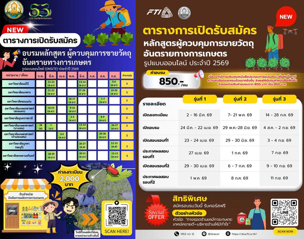 กรมวิชาการเกษตร เดินหน้ายกระดับมาตรฐานการใช้ปัจจัยการผลิตทางการเกษตร ผ่านโครงการฝึกอบรมหลักสูตร “ผู้ควบคุมการขายวัตถุอันตรายทางการเกษตร” มุ่งเสริมสร้างความรู้ด้านกฎหมาย และวิชาการแก่ผู้ประกอบการร้านจำหน่ายวัตถุอันตรายทางการเกษตร ปุ๋ย และพันธุ์พืช เพื่อให้สามารถปฏิบัติหน้าที่ได้อย่างถูกต้องตามหลักวิชาการ และสอดคล้องกับนโยบายความปลอดภัยอาหารของ กระทรวงเกษตรและสหกรณ์