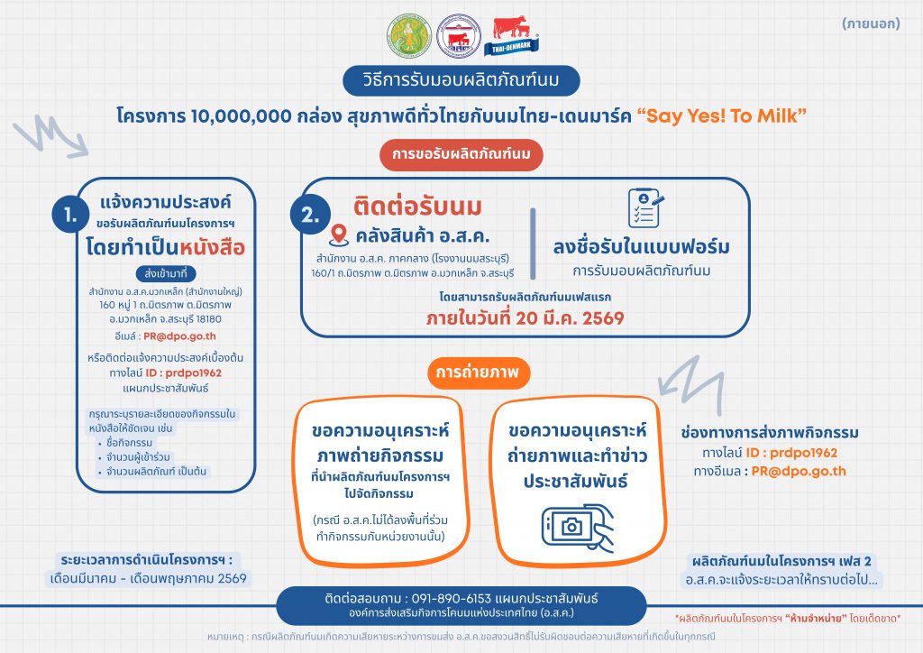 ด้วย องค์การส่งเสริมกิจการโคนแห่งประเทศไทย (อ.ส.ค.) จัดทำ โครงการ 10,000,000 กล่อง สุขภาพดีทั่วไทยกับนมไทย-เดนมาร์ค “Say Yes! to Milk” เพื่อรณรงค์ให้ประชาชนทั่วไปรับเปลี่ยนพฤติกรรมหันมาบริโภคนมและตระหนักถึงความสำคัญ ของการดูแลสุแลขภาพให้มากขึ้น