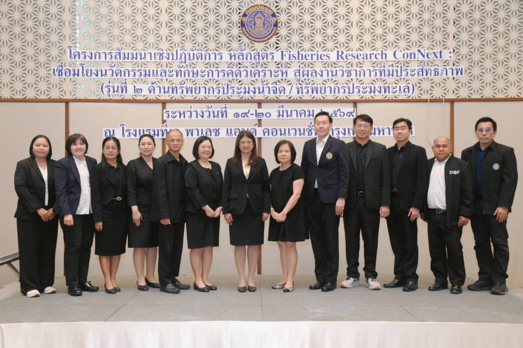 วันพฤหัสบดีที่ 19 มีนาคม 2569 ณ โรงแรม ทีเค. พาเลซ แอนด์ คอนเวนชั่น กรุงเทพมหานคร นางฐิติพร หลาวประเสริฐ อธิบดีกรมประมง เป็นประธานเปิดงานสัมมนาเชิงปฏิบัติการ หลักสูตร “Fisheries Research ConNext” รุ่นที่ 2 ภายใต้หัวข้อ “เชื่อมโยงนวัตกรรมและทักษะการคิดวิเคราะห์ สู่ผลงานวิชาการที่มีประสิทธิภาพ” เสริมสร้างศักยภาพและพัฒนาทักษะเฉพาะทางให้แก่นักวิจัยของกรมประมง ยกระดับมาตรฐานงานวิจัยให้เป็นที่ยอมรับในระดับสากล สามารถนำงานวิจัยไปใช้ประโยชน์ได้อย่างเป็นรูปธรรม