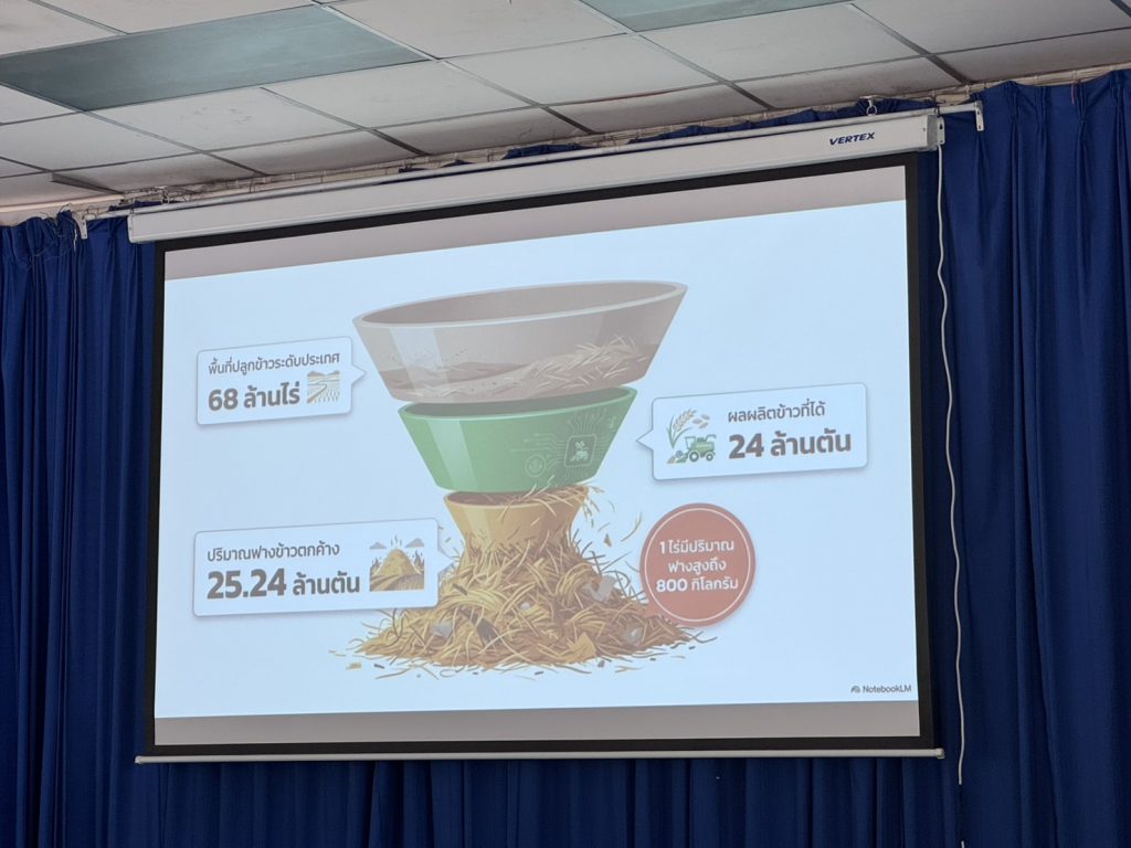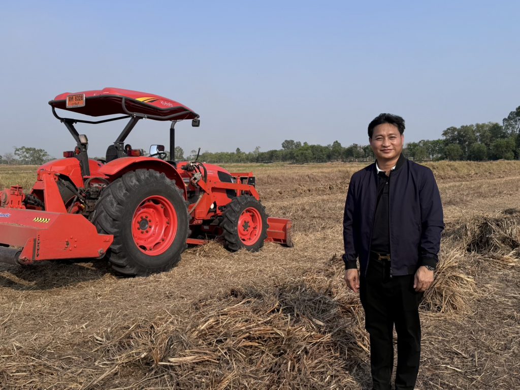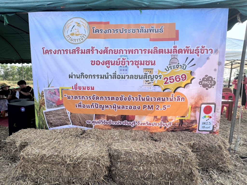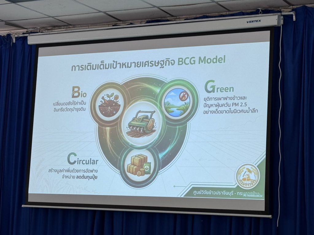 นายโอวาท ยิ่งลาภ รองอธิบดีกรมการข้าว เปิดเผยภายหลังนำคณะสื่อมวลชนลงพื้นที่ติดตามผลการดำเนินงานและชมการสาธิตนวัตกรรม “เครื่องย่อยกำจัดตอซังข้าว (Rotary Mulcher)” ณ ศูนย์วิจัยข้าวปราจีนบุรี ว่า ปัจจุบันประเทศไทยมีฟางข้าวและตอซังตกค้างในนาข้าวรวมกว่า 42 ล้านตันต่อปี โดยเฉพาะในพื้นที่ภาคกลาง ภาคตะวันออกเฉียงเหนือ และภาคตะวันออก โดยในพื้นที่นาน้ำลึกจังหวัดปราจีนบุรีและใกล้เคียงมักประสบปัญหาตอซังและฟางข้าวที่มีปริมาณมากและยาวกว่าปกติ ทำให้เกษตรกรนิยมใช้วิธีการเผาเพื่อความรวดเร็วในการเตรียมดิน ซึ่งส่งผลกระทบต่อสิ่งแวดล้อม ทำลายโครงสร้างดิน และเป็นต้นเหตุของฝุ่นละออง PM 2.5 กรมการเข้าว จึงได้ส่งเสริมการใช้เครื่อง Rotary Mulcher ซึ่งสามารถสับย่อยตอซังที่หนาแน่นได้ละเอียดในขั้นตอนเดียว ช่วยให้ฟางย่อยสลายเป็นปุ๋ยเร็วกว่าการไถกลบแบบเดิมถึง 1 เท่าตัว ส่งผลให้ดินร่วนซุย รากข้าวแข็งแรง และลดการใช้ปุ๋ยเคมีลงได้ถึง 10-20% เพื่อ ยุติการเผาในที่โล่ง: ลดมลพิษทางอากาศและก๊าซเรือนกระจก ฟื้นฟูความอุดมสมบูรณ์ของดิน: เปลี่ยนตอซังเป็นอินทรียวัตถุ ลดการใช้ปุ๋ยเคมี และยกระดับเกษตรกรรมอัจฉริยะ: โดยการใช้เครื่องจักรที่ทันสมัยช่วยประหยัดเวลาและแรงงาน ที่ถือเป็นจิ๊กซอว์สำคัญในการขับเคลื่อนนโยบายความเป็นกลางทางคาร์บอน (Carbon Neutrality) ของรัฐบาล