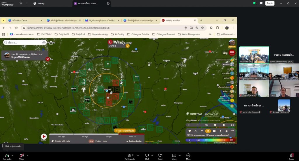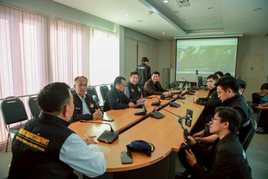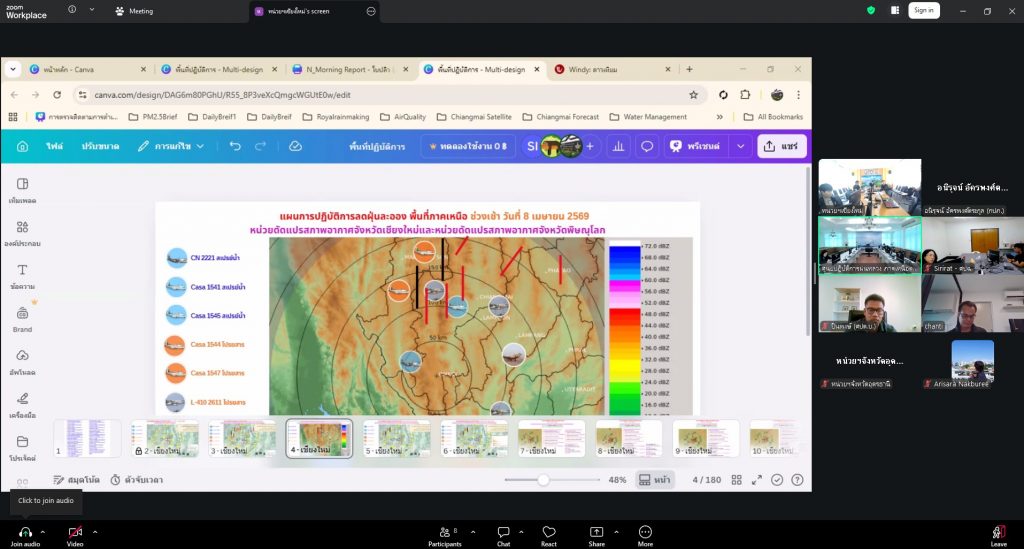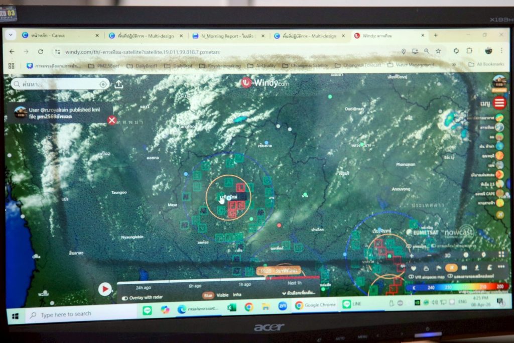 วันที่ 8 เมษายน 2569 เวลา 16.00 น. นายราเชน ศิลปะรายะ อธิบดีกรมฝนหลวงและการบินเกษตร พร้อมด้วยนายไพจิตร เค้ากล้า รองอธิบดีกรมฝนหลวงและการบินเกษตร ด้านวิชาการ และนายฉันติ เดชโยธิน ผู้เชี่ยวชาญด้านวิจัยและพัฒนาวิทยาศาสตร์บรรยากาศประยุกต์ ลงพื้นที่ จ.เชียงใหม่ เพื่อติดตามการปฏิบัติการดัดแปรสภาพอากาศบรรเทาปัญหาฝุ่นละอองขนาดเล็ก PM 2.5 ในพื้นที่ภาคเหนือ โดยมีผู้บริหารและเจ้าหน้าที่เข้าร่วมประชุมและวางแผนภารกิจในวันถัดไป ณ หน่วยดัดแปรสภาพอากาศ จ.เชียงใหม่