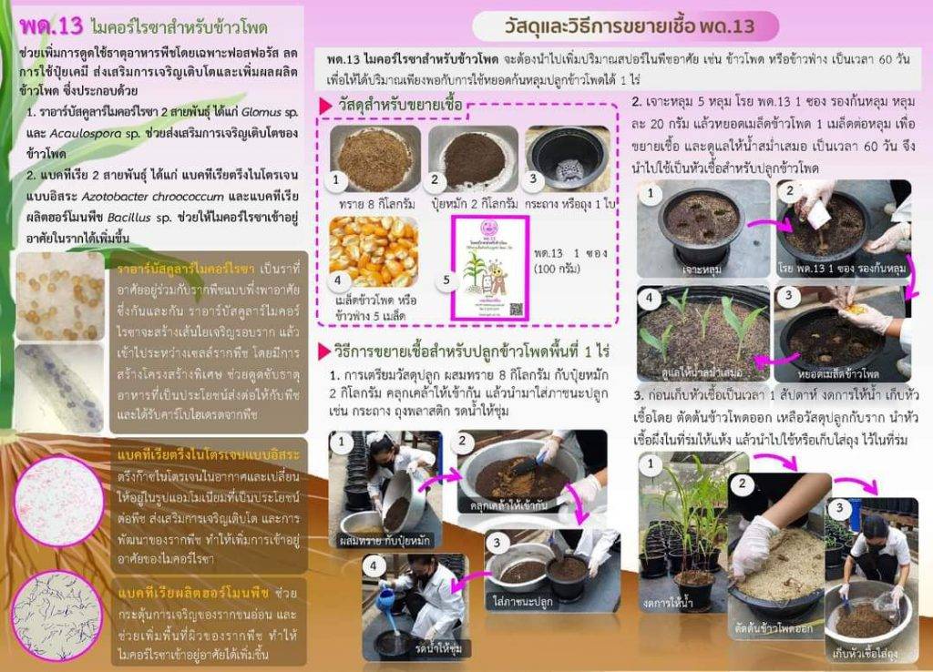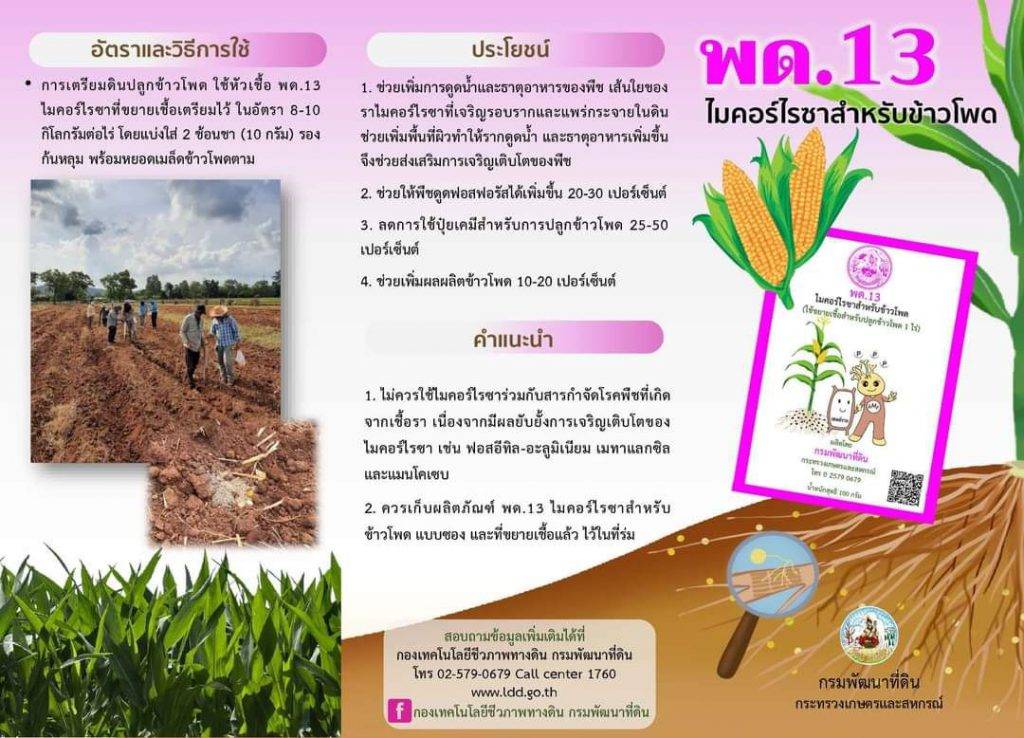 นางสาวเบญจพร ชาครานนท์ อธิบดีกรมพัฒนาที่ดิน เปิดเผยว่า กรมพัฒนาที่ดินได้ดำเนินการวิจัยคิดค้นนวัตกรรมการใช้จุลินทรีย์ช่วยเพิ่มแร่ธาตุอาหารให้กับพืชในรูปแบบปุ๋ยชีวภาพ ช่วยให้เกษตรกรสามารถลดต้นทุนการผลิต เพิ่มรายได้เกษตรกร และผู้บริโภคปลอดภัยจากสารพิษ ทำให้มีสุขภาพดี รักษาสมดุลของระบบนิเวศ สนับสนุนการผลิตอาหารปลอดภัยและช่วยสนับสนุนนโยบายการขับเคลื่อนวาระเกษตรอินทรีย์แห่งชาติ โดยการคัดเลือกเชื้อราอาบัสคูลาร์ไมคอร์ไรซาที่มีประสิทธิภาพในการส่งเสริมการเจริญเติบโตของพืช และในปี 2563 จึงนำมาพัฒนาเป็นผลิตภัณฑ์จุลินทรีย์ชนิดใหม่ ใช้ชื่อว่า “พด.13 ไมคอร์ไรซาสำหรับข้าวโพด” ซึ่งประกอบด้วย ราอาร์บัสคูลาร์ไมคอร์ไรซา 2 สายพันธุ์ (Glomus sp. และ Acaulospora sp. ช่วยส่งเสริมการเจริญเติบโตของข้าวโพด) และแบคทีเรีย 2 สายพันธุ์ (แบคทีเรียตรึงไนโตรเจนแบบอิสระ Azotobacter chroococcum และแบคทีเรีย ผลิตฮอร์โมนพืช Bacillus sp. ช่วยให้ไมคอร์ไรซาเข้าอยู่อาศัยในรากได้เพิ่มขึ้น)