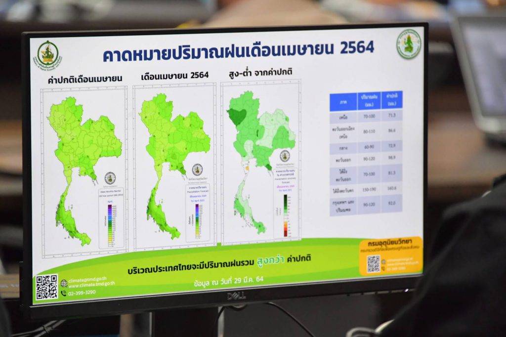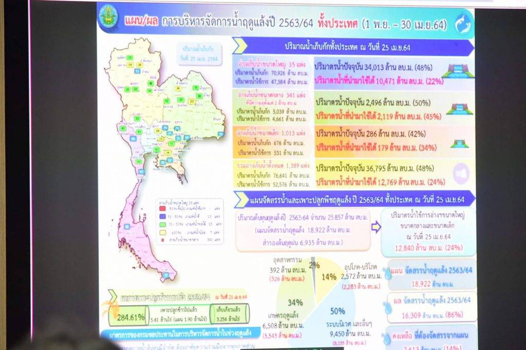 ด้านดร.ทวีศักดิ์ ธนเดโชพล รองอธิบดีกรมชลประทาน เปิดเผยว่า ปัจจุบัน (26 เม.ย.64) อ่างเก็บน้ำขนาดใหญ่และขนาดกลางทั่วประเทศ มีปริมาณน้ำรวมกันทั้งสิ้น 36,487 ล้าน ลบ.ม. คิดเป็นร้อยละ 48 ของความจุอ่างฯ รวมกัน มีน้ำใช้การได้ประมาณ 12,694 ล้าน ลบ.ม. ขณะนี้ทั้งประเทศมีการใช้น้ำไปแล้ว 16,390 ล้าน ลบ.ม. คิดเป็นร้อยละ 87 ของแผนฯ เฉพาะ 4 เขื่อนหลักลุ่มน้ำเจ้าพระยา (เขื่อนภูมิพล เขื่อนสิริกิติ์ เขื่อนแควน้อยบำรุงแดน และเขื่อนป่าสักชลสิทธิ์) มีปริมาณน้ำรวมกันประมาณ 8,975 ล้าน ลบ.ม. หรือร้อยละ 36 ของความจุอ่างฯ รวมกัน มีน้ำใช้การได้ประมาณ 2,279 ล้าน ลบ.ม. จนถึงขณะนี้มีการใช้น้ำไปแล้ว 4,801 ล้าน ลบ.ม. คิดเป็นร้อยละ 96 ของแผนฯ