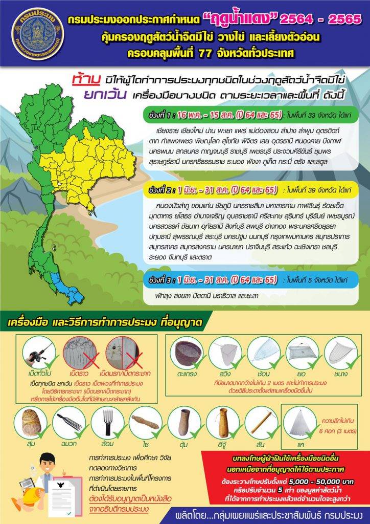 กรมประมงออกประกาศกำหนดฤดูสัตว์น้ำจืดมีไข่ “ฤดูน้ำแดง” ทั่วประเทศ เผยปรับมาตรการคุ้มครองสัตว์น้ำจืด มีไข่ วางไข่ และเลี้ยงตัวอ่อนให้เหมาะสมสอดคล้องกับสภาวการณ์ในปัจจุบันของปริมาณน้ำฝน ปริมาณน้ำท่าและข้อมูลการพัฒนาระบบสืบพันธุ์และผสมพันธุ์วางไข่ของสัตว์น้ำจืด ลดผลกระทบต่อวิถีการทำประมงของชาวบ้าน ประเดิมวันแรก 16 พฤษภาคม 2564 ขอความร่วมมือปฏิบัติตามกฎหมายโดยเคร่งครัดร่วมกันอนุรักษ์สัตว์น้ำจืดอย่างยั่งยืน