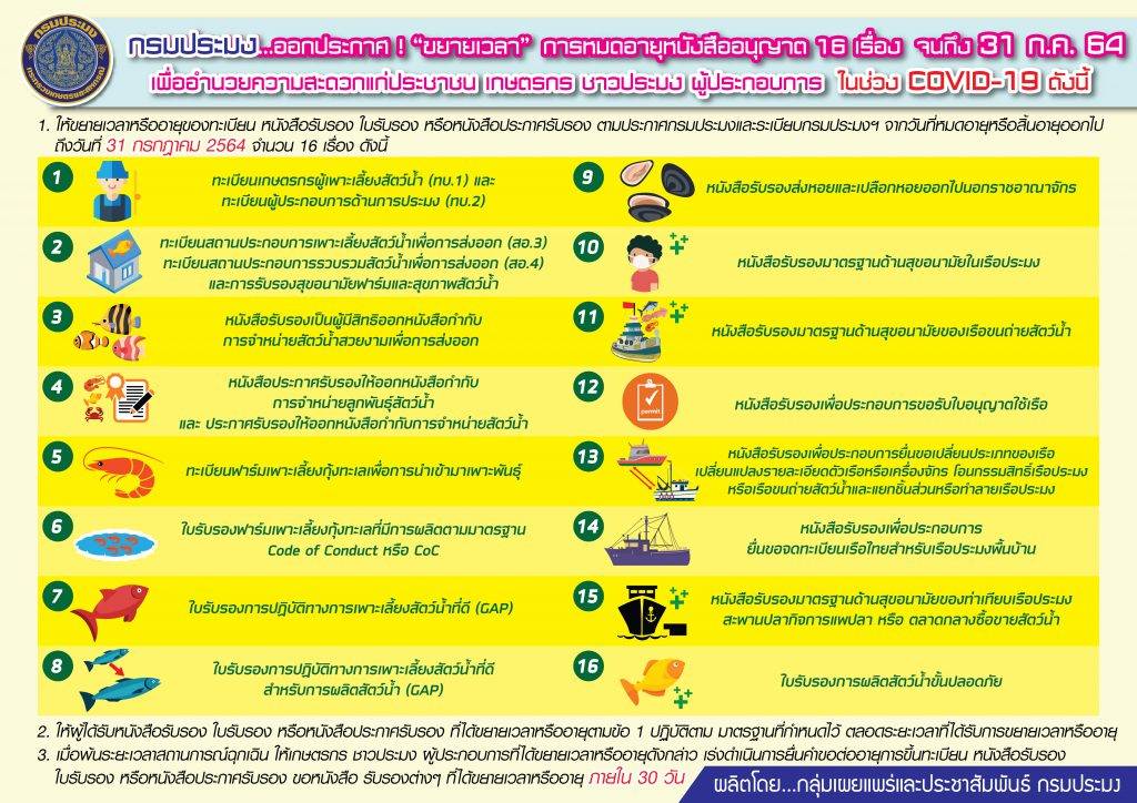 1. ให้ขยายเวลาหรืออายุของทะเบียน หนังสือรับรอง ใบรับรอง หรือหนังสือประกาศรับรอง ตามประกาศกรมประมงและระเบียบกรมประมงฯ จากวันที่หมดอายุหรือสิ้นอายุออกไปถึงวันที่ 31 กรกฎาคม 2564 จำนวน 16 เรื่อง