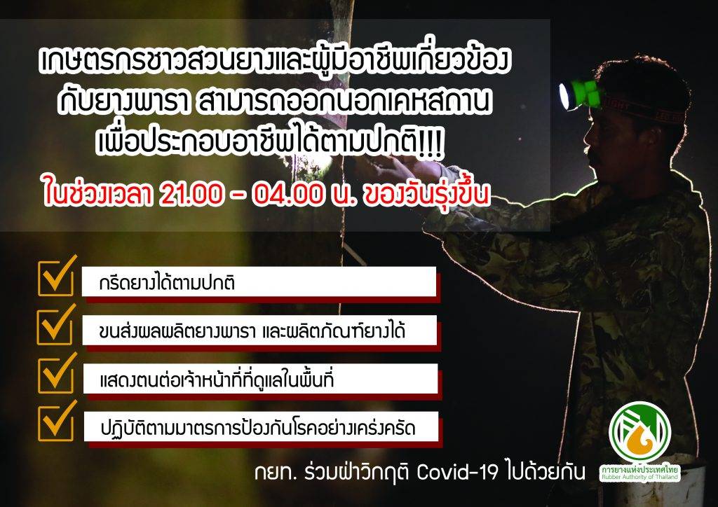 การยางแห่งประเทศไทย (กยท.) ย้ำชัด ชาวสวนยางและผู้มีอาชีพเกี่ยวข้องกับยางพาราได้รับการยกเว้นให้สามารถออกนอกเคหสถานเพื่อประกอบอาชีพ ในเวลาตั้งแต่ 3 ทุ่ม – ตี 4 ได้ เพียงปฏิบัติตามมาตรการป้องกันโรคอย่างเคร่งครัด