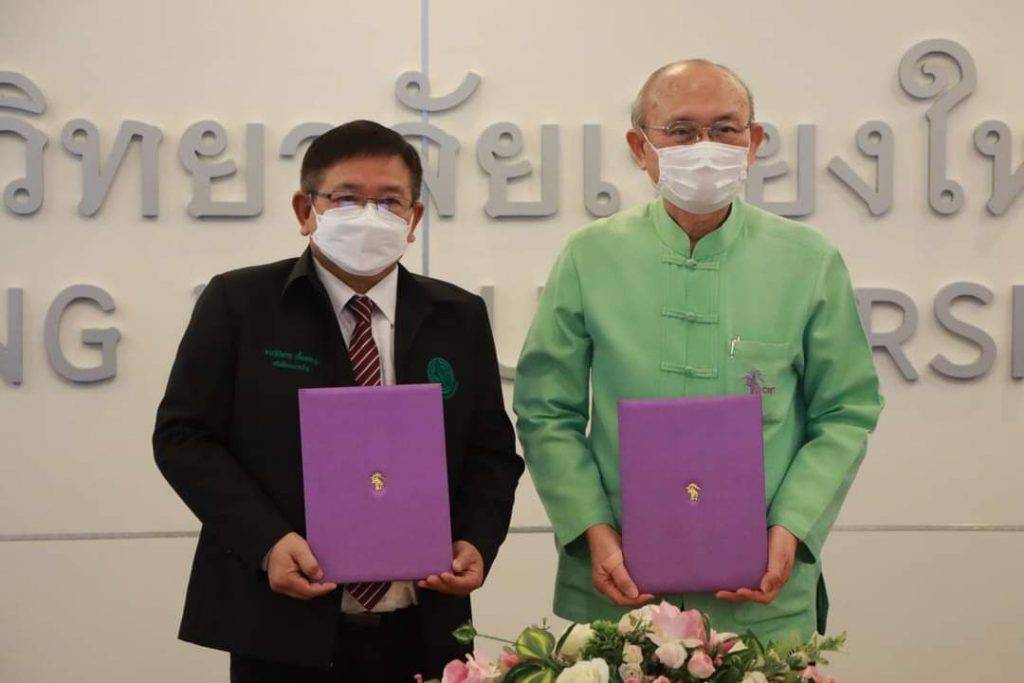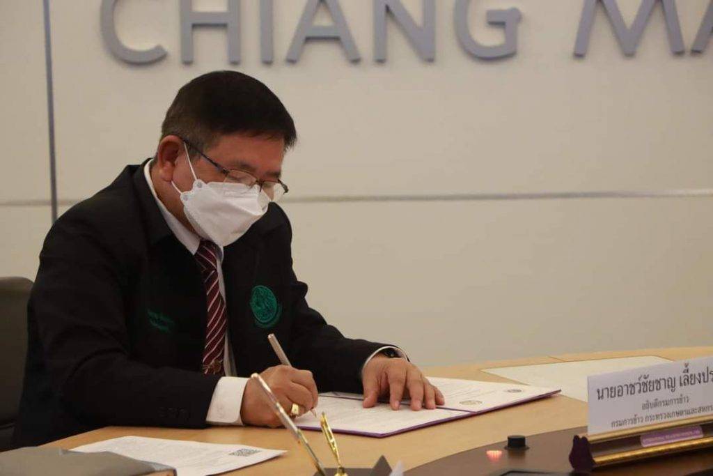 วันที่ 8 กันยายน 2564 กระทรวงเกษตรและสหกรณ์ โดยกรมการข้าว พร้อมด้วยมหาวิทยาลัยเชียงใหม่ ได้ร่วมกันทำพิธีลงนามบันทึกข้อตกลงความร่วมมือทางวิชาการ (MOU) โดยจะเป็นการนำเมล็ดพันธุ์ข้าวที่มีคุณภาพดีเด่นจากกรมการข้าว จำนวน 5 สายพันธุ์ มาปรับปรุงพันธุ์ด้วยเทคโนโลยีไอออนพลังงานต่ำ และคัดเลือกให้ได้สายพันธุ์ที่มีแนวโน้มให้ผลผลิตสูงและต้านทานต่อโรคและแมลงศัตรูข้าว เพื่อให้ได้ข้าวสายพันธุ์ดี สามารถลดต้นทุนการผลิต เพิ่มผลผลิต และสร้างรายได้ให้แก่เกษตรกร โดยมีผู้แทนจากทั้ง 2 หน่วยงาน เป็นผู้ลงนาม ประกอบด้วย นายอาชว์ชัยชาญ เลี้ยงประยูร อธิบดีกรมการข้าว และศาสตราจารย์คลินิกนายแพทย์นิเวศน์ นันทจิต อธิการบดีมหาวิทยาลัยเชียงใหม่ และมีนายสถาพร ตัมพวิสิฏฐ์ ผู้อำนวยการ กองวิจัยและพัฒนาข้าว นายนิพนธ์ บุญมี ผู้อำนวยการศูนย์วิจัยข้าวเชียงใหม่ ศาสตราจารย์เกียรติคุณ ดร.สัญชัย จตุรสิทธา ผู้อำนวยการสถาบันวิทยาศาสตร์ และศาสตราจารย์เกียรติคุณ ดร.ถิรพัฒน์ วิลัยทอง ผู้อำนวยการศูนย์ความเป็นเลิศด้านฟิสิกส์ ร่วมเป็นพยานการลงนามในครั้งนี้ ณ ห้องประชุมตะวัน กังวานพงศ์ สำนักงานงานมหาวิทยาลัยเชียงใหม่