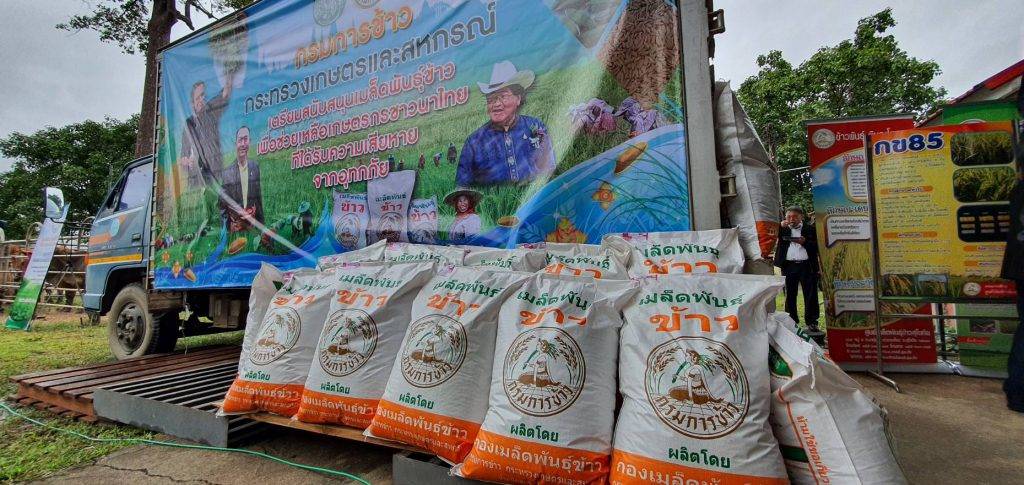 ด้านนายณัฎฐกิตติ์ ของทิพย์ รองอธิบดีกรมการข้าว เปิดเผยว่า ในส่วนของกรมการข้าวจะให้การสนับสนุนเมล็ดพันธุ์ข้าวแก่เกษตรกรผู้ปลูกข้าวที่ประสบภัยพิบัติจนทำให้ต้นข้าวที่ปลูกไว้เสียหายสิ้นเชิง หรือเสียหายมากกว่าร้อยละ 80 และจังหวัดประกาศเป็นเขตประสบภัยพิบัติในกรณีฉุกเฉินแล้ว และให้การสนับสนุนเมล็ดพันธุ์ข้าวแก่เกษตรกรผู้ปลูกข้าวในพื้นที่ห่างไกลความเจริญและขาดแคลนเมล็ดพันธุ์ข้าวเพื่อการเพาะปลูก เพื่อส่งเสริมให้เกษตรกรมีการจัดทำแปลงผลิตเมล็ดพันธุ์ข้าวไว้ใช้ปลูกในฤดูต่อไป หรือกระจายให้เกษตรกรอื่นในชุมชนใช้เพาะปลูก โดยคุณสมบัติของเกษตรกรผู้จะได้รับการสนับสนุนเมล็ดพันธุ์ข้าว ต้องเป็นเกษตรกรผู้ปลูกข้าวที่ได้รับผลกระทบจากภัยพิบัติจนขาดแคลนเมล็ดพันธุ์ข้าวไว้ใช้ปลูกในฤดูเดียวกัน และมีความประสงค์จะขอรับการสนับสนุนเมล็ดพันธุ์ข้าวที่จะเพาะปลูกในฤดูเดียวกัน หรือเป็นเกษตรกรผู้ปลูกข้าวในพื้นที่ห่างไกลความเจริญและขาดแคลนเมล็ดพันธุ์ข้าวเพื่อการเพาะปลูก เพื่อส่งเสริมให้เกษตรกรมีการจัดทำแปลงผลิตเมล็ดพันธุ์ข้าวไว้ใช้ปลูกในฤดูต่อไป หรือกระจายให้เกษตรกรอื่นในชุมชนใช้เพาะปลูก