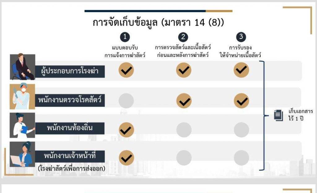กฎกระทรวง การจัดเก็บข้อมูลของสัตว์ที่เข้าสู่โรงฆ่าสัตว์และเนื้อสัตว์ที่ออกจากโรงฆ่าสัตว์ พ.ศ.2564 กำหนดหลักเกณฑ์การจัดเก็บข้อมูลของสัตว์ที่เข้าสู่โรงฆ่าสัตว์และเนื้อสัตว์ที่ออกจากโรงฆ่าสัตว์ เพื่อประโยชน์ในการตรวจสอบย้อนกลับข้อมูลของเนื้อสัตว์ตลอดกระบวนการผลิตและการเรียกคืนเนื้อสัตว์ และเพื่อให้ผู้บริโภคได้บริโภคเนื้อสัตว์ที่ถูกสุขอนามัย มีสาระสำคัญ ให้พนักงานเจ้าหน้าที่ พนักงานท้องถิ่น พนักงานตรวจโรคสัตว์ และผู้ประกอบการโรงฆ่าสัตว์ มีการจัดเก็บข้อมูล ประกอบด้วย 1. ใบแจ้งและตอบรับการแจ้งฆ่าสัตว์ 2. รายงานการตรวจโรคสัตว์ก่อนและหลังการฆ่าสัตว์ และ 3. รายงานรับรองให้จำหน่ายเนื้อสัตว์ ให้เก็บข้อมูลทั้งหมดไว้อย่างน้อย 1 ปี โดยถ้าไม่เก็บมีกำหนดโทษพักใช้หรือเพิกถอนเฉพาะโรงฆ่าสัตว์นั้น