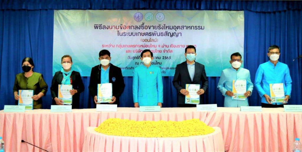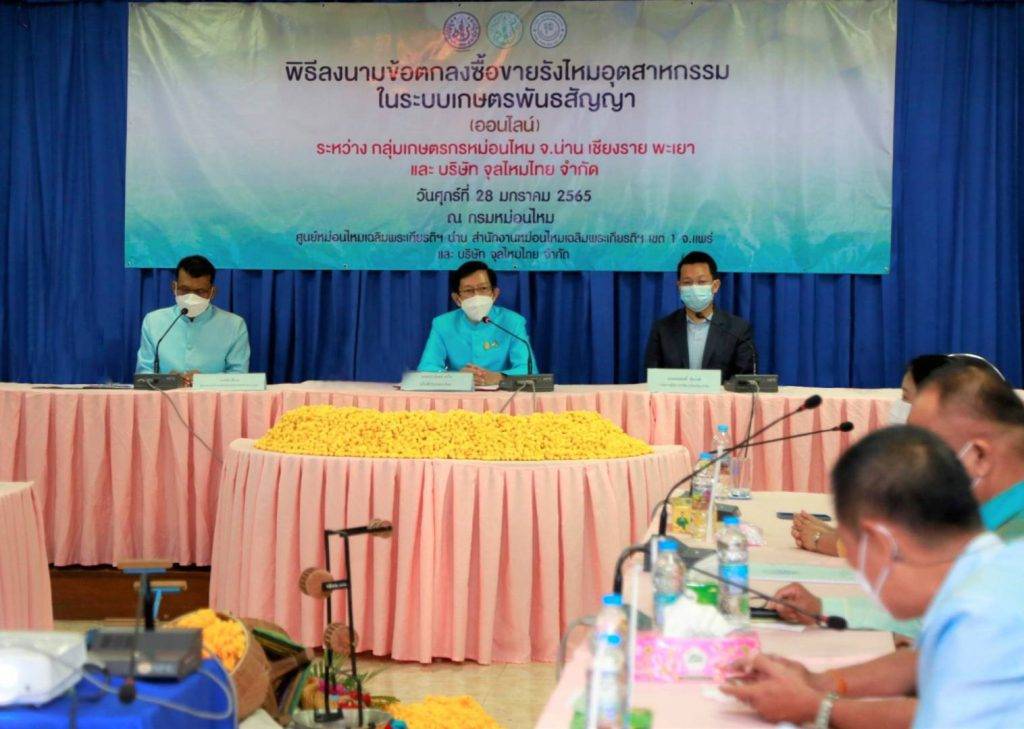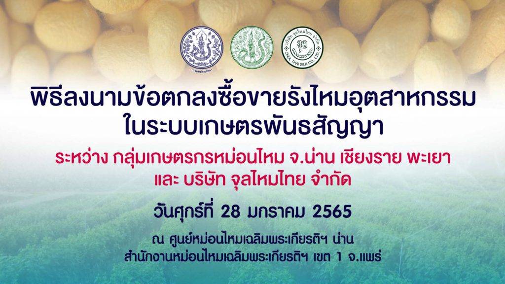 กรมหม่อนไหม กระทรวงเกษตรและสหกรณ์ เดินหน้าขับเคลื่อนนโยบาย “ตลาดนำการผลิต” ของ ดร.เฉลิมชัย ศรีอ่อน รัฐมนตรีว่าการกระทรวงเกษตรและสหกรณ์ จัดพิธีลงนามข้อตกลงซื้อขายรังไหมอุตสาหกรรมในระบบเกษตรพันธสัญญา ระหว่างกลุ่มเกษตรกรหม่อนไหม จ.น่าน เชียงราย พะเยา และบริษัท จุลไหมไทย จำกัด เมื่อวันที่ 28 มกราคม 2565 ณ ศูนย์หม่อนไหมเฉลิมพระเกียรติฯ น่าน พร้อมคาดการณ์ผลผลิตปี 2565 ตามแผนการเลี้ยงไหม 10 รุ่น จะได้ผลผลิตรังไหมไม่น้อยกว่า 75 ตัน และจะสร้างรายได้ให้แก่เกษตรกร มากกว่า 12 ล้านบาท